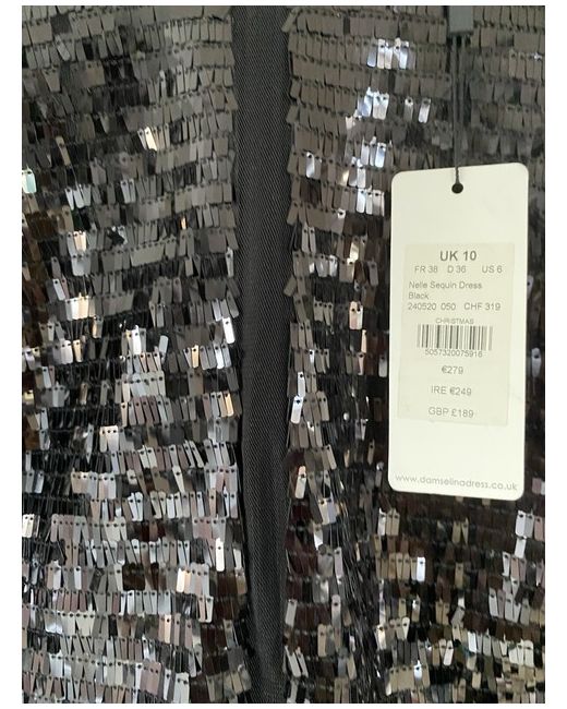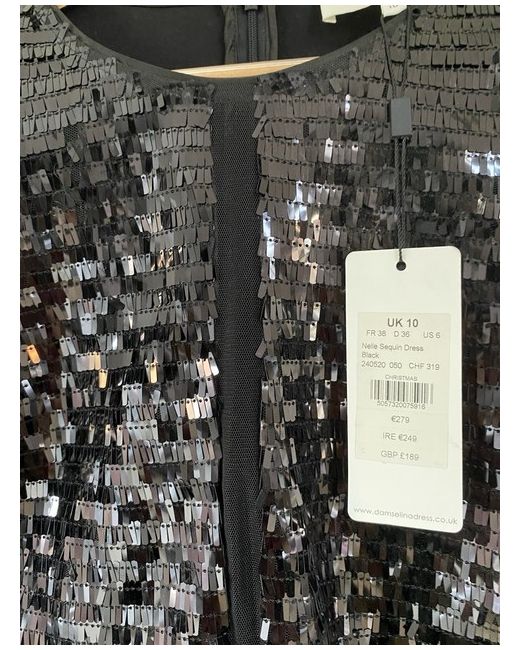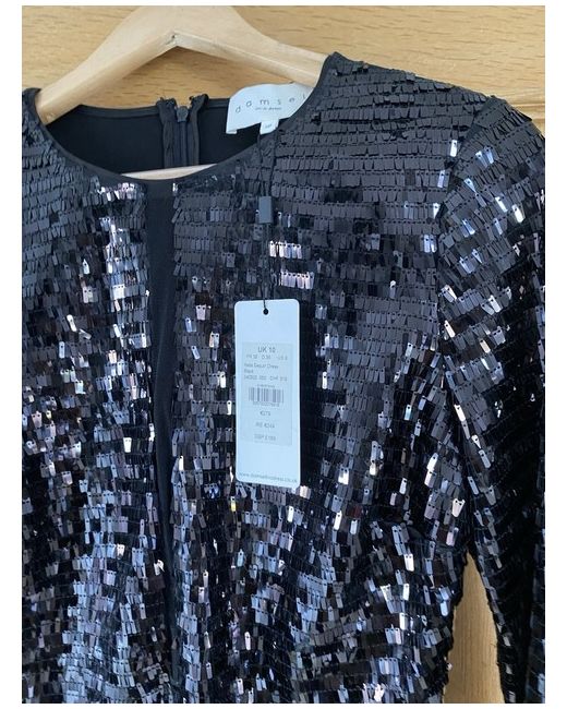 This is a stylish black sequin dress in size 10 by Damson in a Dress. The dress features a pencil style with a short length, making it suitable for parties or cocktail events. The sequin detailing adds a touch of glamour to the outfit, making it perfect for those who want to make a statement. Made for women, this dress is a regular fit and a must-have addition to any wardrobe for those special occasions.