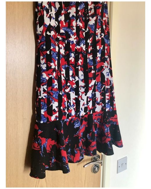 Red, white, blue and black knee-length dress with stripe and floral patterns. Ruffle / frill trim. Material: 100% polyester.
