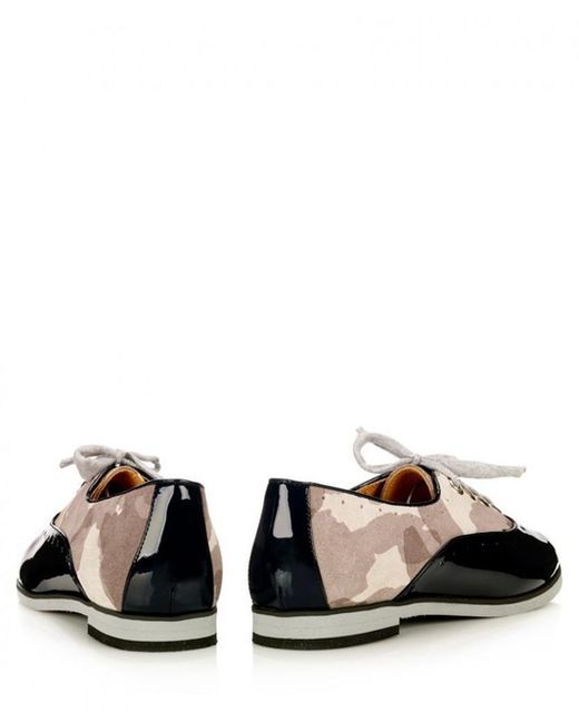 Materials: upper - patent leather, lining - leather, insole - leather, sole - synthetic Essential details: grey camouflage fabric and black patent laced shoes with perforated detailing and grey fabric laces Colour: black, grey.