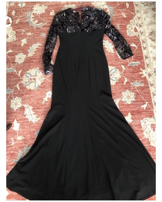 Stunning dress. Bought for an evening function but decided to wear a different gown and it has been stored away. The top has a built in light weight bra so you wouldn’t necessarily need to wear one. The sleeves are made of a nice weight mesh lace which are embellished with sequins in hues of rose/bronze gold and bluish grey which sometimes look black in different lights. There are shoulders pads. As you will see from photos the skirts flares out.Long back zip closing, fully lined apart from the sleeves. The main dress is made of a heavy crepe stretch jersey and the lining is made of polyester fabric. Length from top of shoulders 160cm, pit to pit 46cm, waist 78cm, hips 90cm, depth of armhole 23cm, across shoulders 43cm Any questions please ask