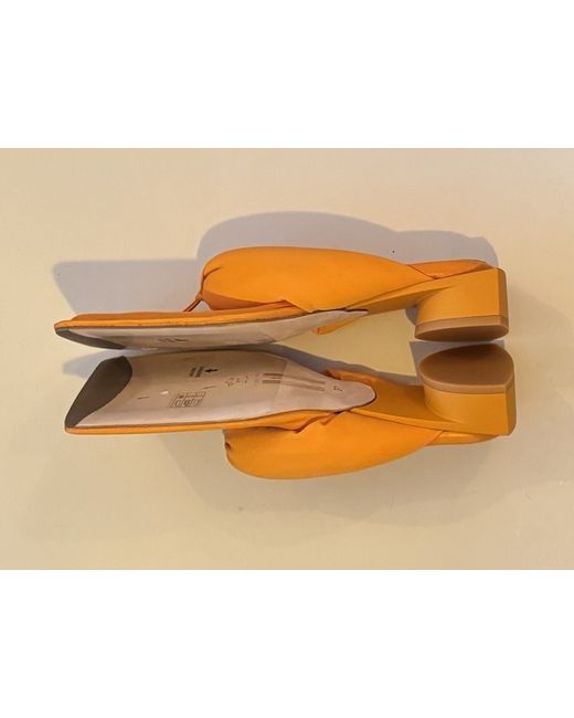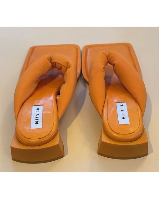 Step into vibrant style with these Miista Orange Sandals, a perfect blend of comfort and bold fashion. Crafted with a luxurious leather upper, these slip-ons boast a striking orange hue that's sure to make a statement with any ensemble. The flat design ensures all-day ease, making them an ideal choice for those who value both style and practicality. UK size 4, these sandals are a versatile addition to any women's wardrobe, ready to complement your casual or more formal attire with effortless elegance.