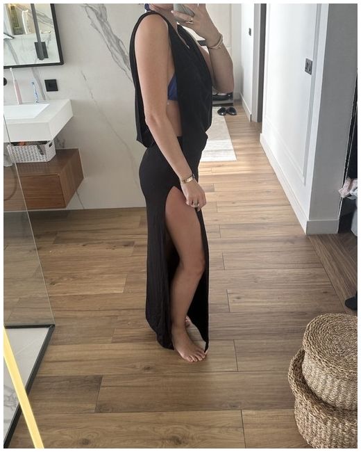 Made from polyester in a classic black colour, the dress features a cowl neck neckline and a pullover closure for ease of wear.