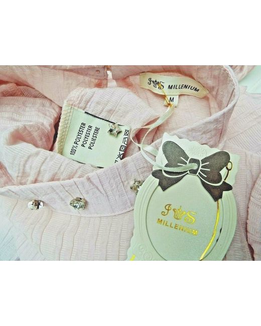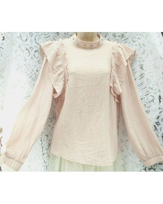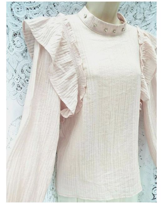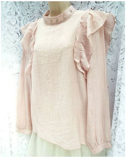 JS MILLENIUM. Pretty pale pink Ruffle Blouse in a crinkle crush fabric. The blouse features sumptuous feminine Shoulder Ruffles. The High Neckline is detailed with sparkling crystal stars. Shoulder - Hem = 26".