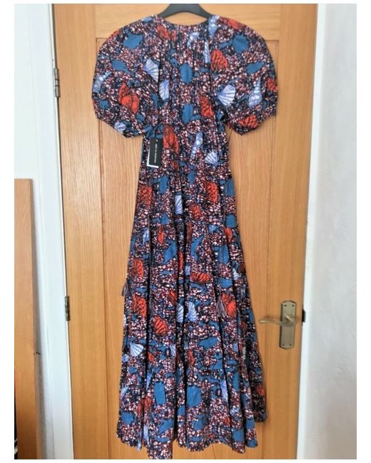 This cotton printed dress by Ulla Johnson has been designed using a seashell/abstract motif. It features a V neckline, adjustable drawstring waist, concealed side pockets, pin tuck puff sleeves/tiered skirt, hand washable.