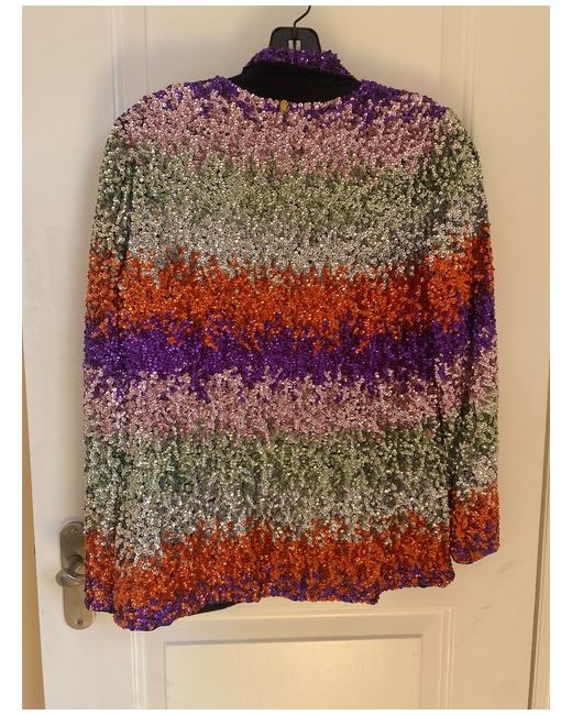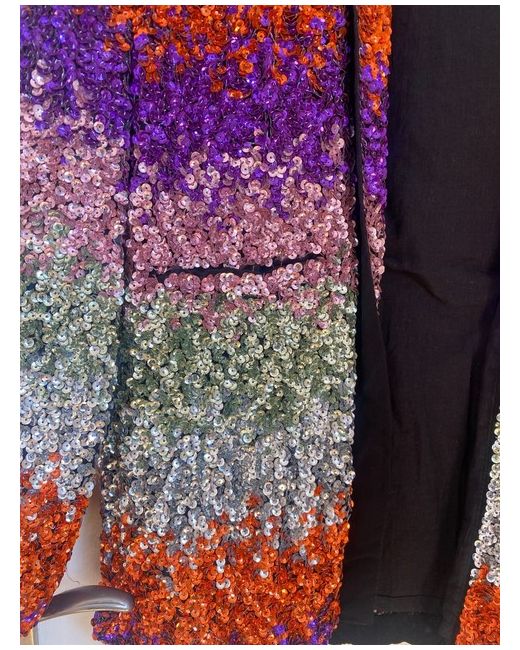 Entirely embroidered with multicolored sequins. Orange, silver, purple, pink and green horizontal stripes. Piped pockets on the front. Long sleeves. E ntirely embroidered with multicolored sequins.