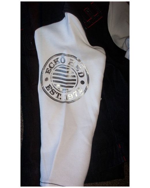 Diamante Ecko Logo On Back. Ladies Ecko Red Denim Jacket. Ecko Silver Foil On Sleeve.