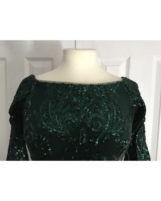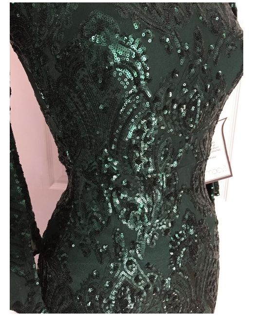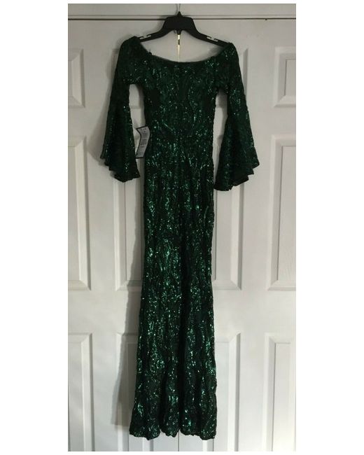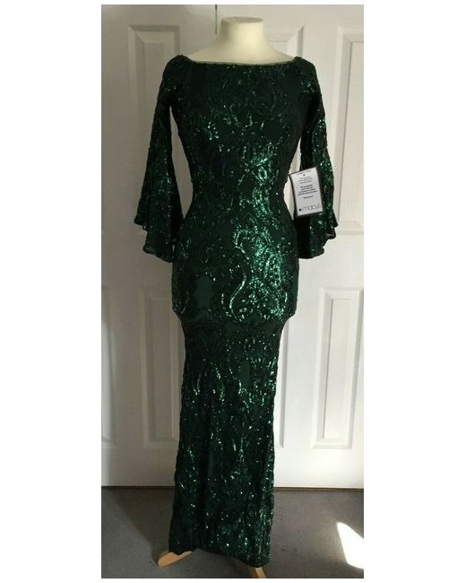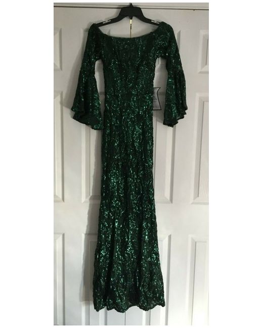 Bell sleeves and off the shoulder. Full sequin. Hugs the body and flares slightly at the bottom. Equivalent dress in red currently on Amazon for £294!