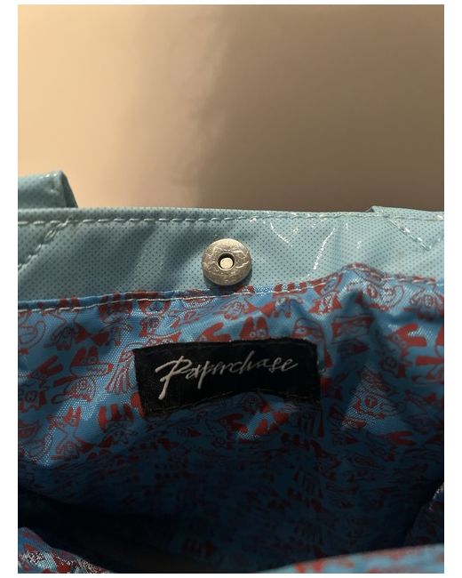 The exterior is made of durable PVC material in a vibrant multicoloured design, while the interior is lined with soft blue cotton. The handle and strap are both made of PVC, making them sturdy and long-lasting.