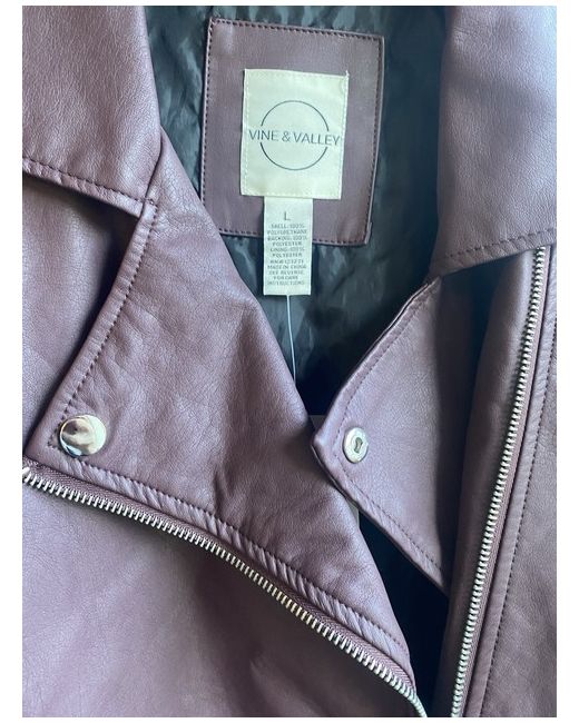 Elevate your wardrobe with the chic Vine & Valley Moto Jacket, a must-have for those who appreciate a blend of style and functionality. Crafted from durable polyurethane, this brown jacket is designed to complement a variety of outfits while providing a touch of edgy elegance. Offered in a size large, the jacket ensures a comfortable fit for the modern woman. The classic motorcycle jacket silhouette merges timeless appeal with a contemporary aesthetic, making it an ideal choice for both daytime ventures and evening escapades.