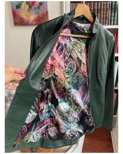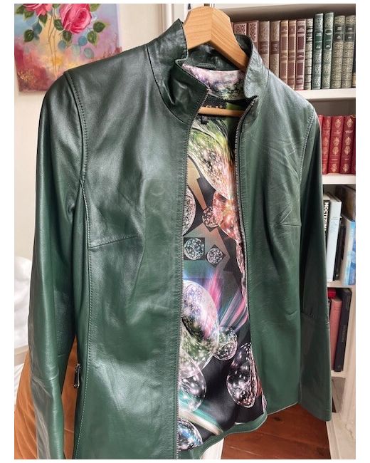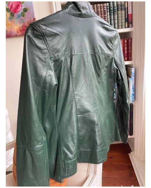 A beautiful green leather jacket brand new never used. Elegant flowery inside.