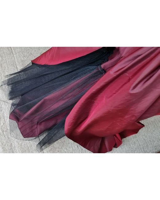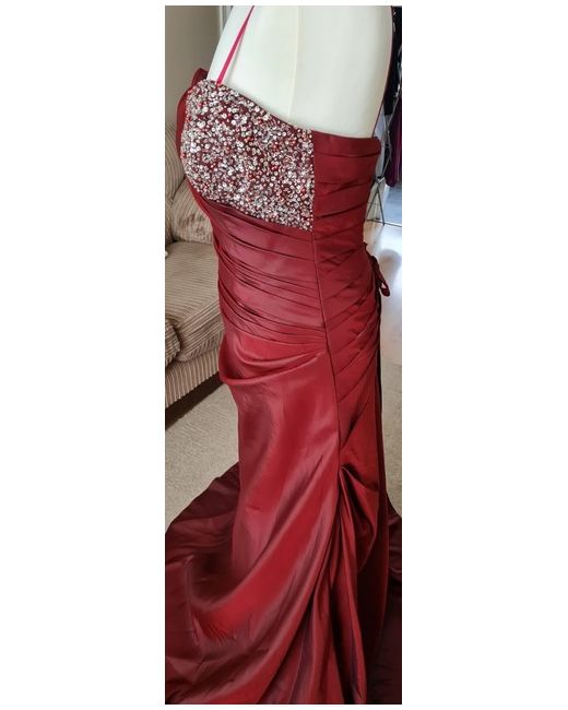 This stunning red ball gown is the perfect addition to any formal occasion. The sleeveless design and long length add an elegant touch, while the size 12 fit ensures a comfortable and flattering look.
