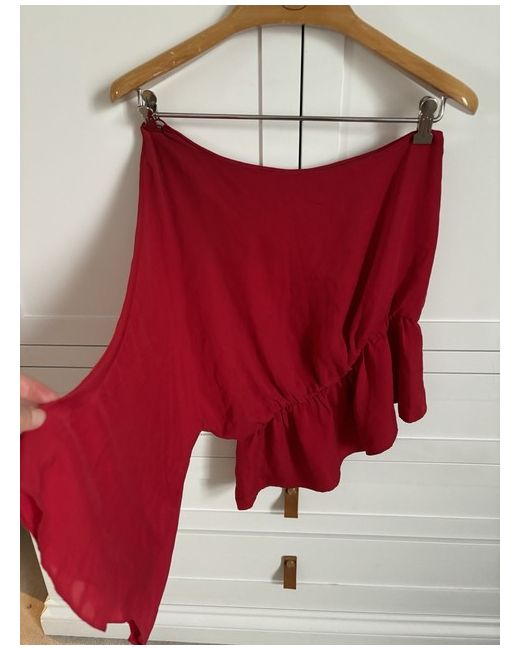 This is a one-sleeve, off the shoulder Halston silk top in red. It is a regular size small and designed for women. Gathered elasticated waist so fits more sizes than just S