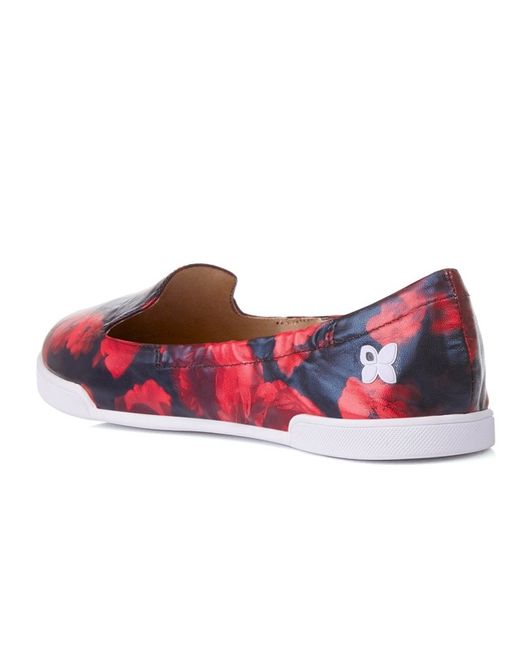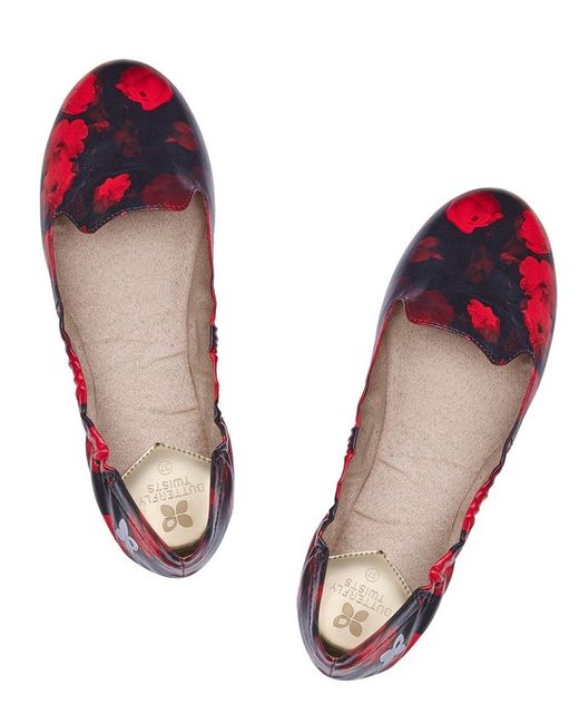 Butterfly twists white colour logo on the side of the heel. Flat ballet style shoes. 'Jade' in Ruby Red colour. Red floral print faux leather upper.