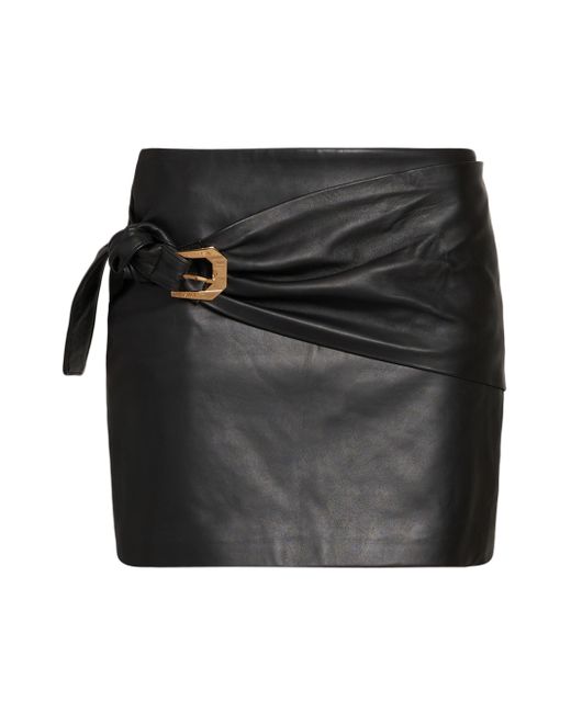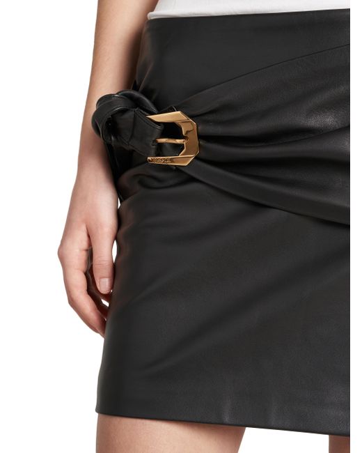 Crafted of smooth leather, this Versace skirt features an asymmetrical wrap-inspired design with a goldtone pin-buckle detail. Back zip closure Leather Lining: 100% cupro Dry clean Imported SIZE & FIT Model measurements: 5'10" tall Model is wearing a US size 4 ABOUT THE BRAND Founded in 1978, Versace is instantly recognizable by the signature Medusa head logo, chosen by founder Gianni Versace for its Greek symbolism. The Italian label is known for its luxe, bold clothing and accessories-think gilding, oversized logos and punchy prints. Since taking over artistic direction, Gianni's sister Donatella Versace has maintained the brand's strong identity, with a renewed vision to give customers the ultimate freedom to express themselves. Advanced European - Versace > Versace > Saks Fifth Avenue > Barneys. Versace. Color: Black. Size: 0.