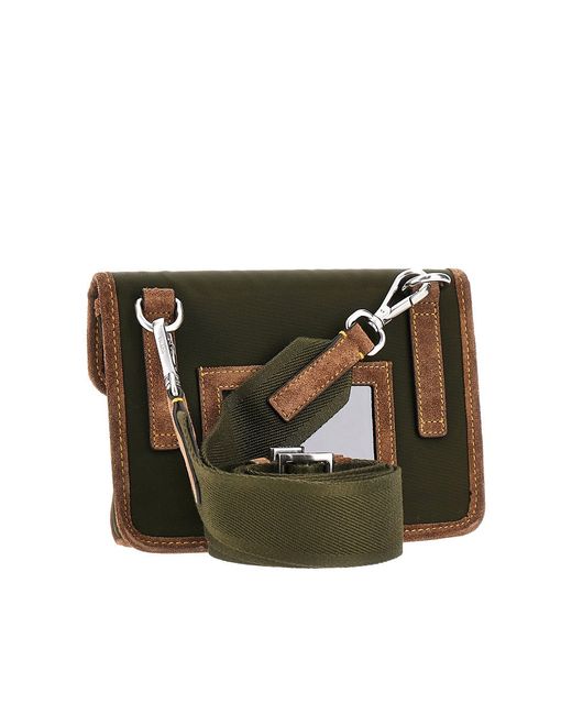 Smartphone-holder pouch in Re-Nylon with suede leather details. Signature enamel and silver-finished metal triangle logo. Flap with snap-buckle closure. Adjustable and detachable webbing strap. Transparent badge pocket on the back. Nylon lining and one inner patch card pocket.