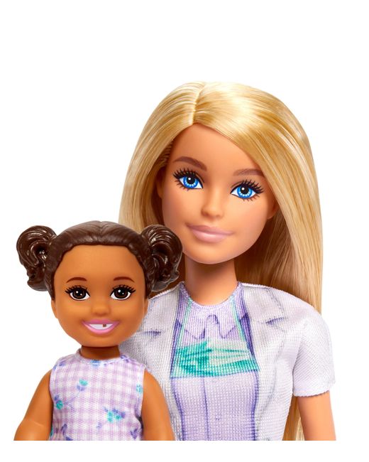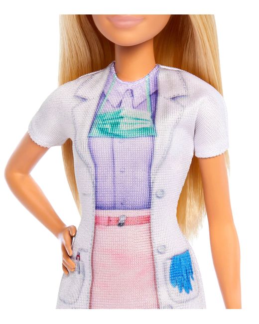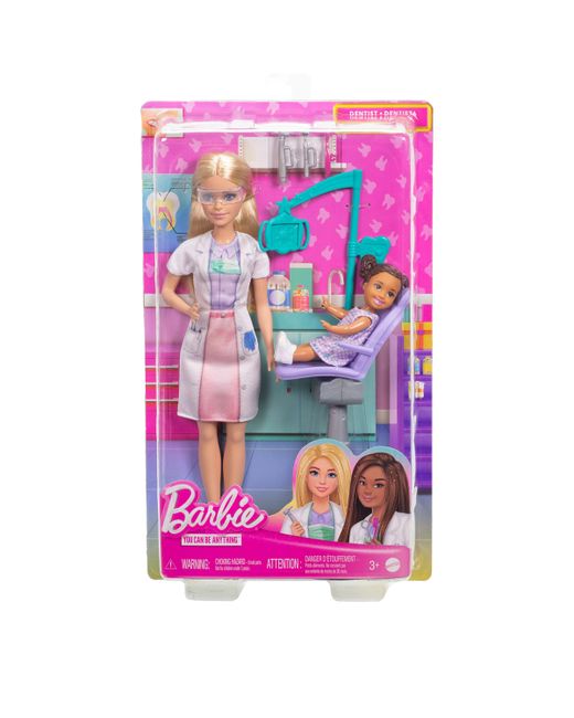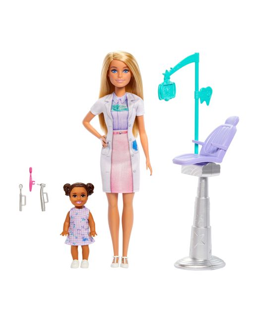 With Barbie, youngsters can explore all kinds of careers from an early age. The Barbie Dentist doll celebrates the world of dentistry, accompanied by a child doll in the dentist's chair. Barbie's printed dress and lab coat allow her to stay clean while examining, while dental tools, a toothbrush and toothpaste help her to teach her patients how to care for their teeth properly.