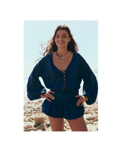 Breezy and billowy, this stunning romper will turn heads with every wear. **Fit:** Blousy top with dropped-waist shorts design **Features:** V-neckline, button-up detailing, banded balloon sleeves, billowy overlay at shorts, drop-waist seam **Why We ❤ It:** Sleek with tall boots or off-duty with beachy sandals, this style has endless ways to wear. Carson Drop-Waist Romper by free-est at Free People in Titan, Size: XS