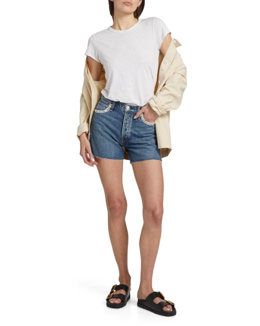 Crafted of cotton, the Vintage Cut-Off denim shorts from rag & bone feature crystal embellishments at the front and a raw-edge hem. Belt loops Five-pocket style Button fly 100% cotton Hand wash Imported SIZE & FIT Rise: about 11.75" Inseam: about 4" Model measurements: 5'10" tall Model is wearing a US size Small ABOUT THE BRAND In 2002, rag & bone founder Marcus Wainwright combined his British heritage with a downtown-New York aesthetic to set the tone for the label. At the heart of the edgy-yet-laid-back brand is its focus on quality craftsmanship and attention to detail. The epitome of cool, off-duty style, it's no wonder the signature second-skin denim is favored by many. Contemporary Sportswear - Denim And Bottoms > Rag & Bone > Saks Fifth Avenue > Barneys. rag & bone. Color: Everit With Jewel. Size: 23.