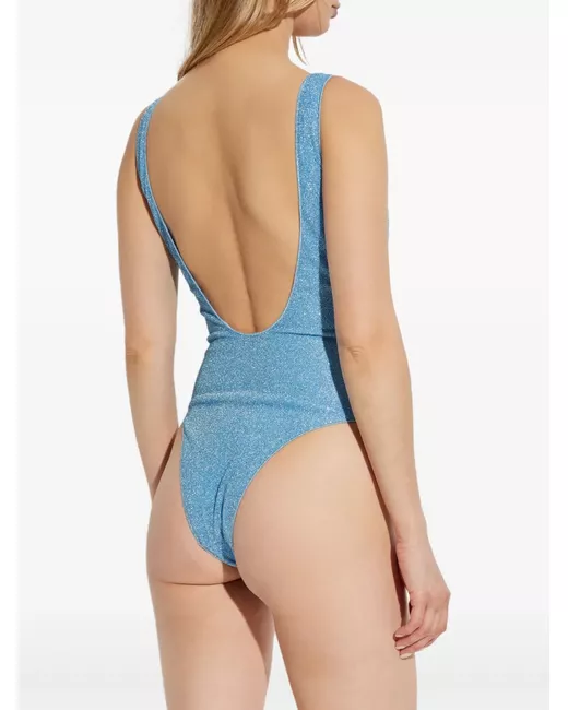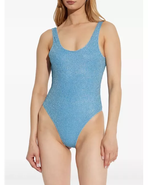 light blue lurex detail scoop neckline wide shoulder straps high-cut leg openings Be mindful to try on swimwear over your own garments.