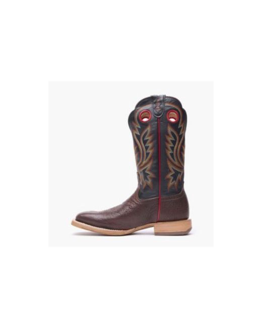 Engineered for rodeo performance, the Prca Collection by Durango is hand-crafted with superior comfort, premium leathers and a low ground feel approved by world champions. The men s 13” Chestnut and Black Eclipse style features shrunken bull hide leather foot and tabs, full-grain leather shaft, leather underlay in tabs, fully leather lined and has a thin hybrid leather insole with heel tuck and memory foam. This style also features the patented fiberglass Dually Shank System for twice the midfoot and torsion stability, rolled shank area, hand nailed and stained genuine leather outsole, ¾ genuine Goodyear welt construction and genuine leather welt with double row cotton stitch. This style is finished off with a high-abrasion resistant rubber heel lift, leather stacked heel base, 1 ¼” stockman heel, square toe and has the iconic Prca ProRodeo logo branded inside the shaft and on the outsole of the boot.