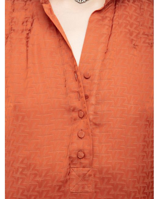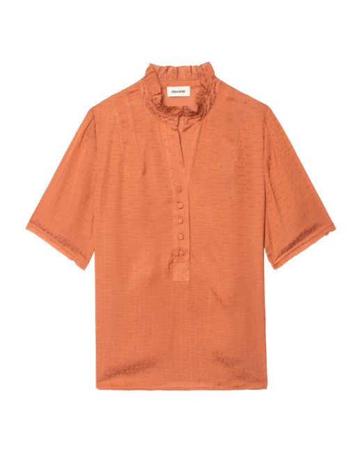 This Topher blouse from Zadig & Voltaire is crafted of satin and features a monogram print with a ruffled collar. Made with recycled polyester Ruffled collar Short sleeves Partial button-front closure 65% recycled polyester/35% polyester Machine wash Imported SIZE & FIT About 22.2" from shoulder to hem Model measurements: 5'10" tall Model is wearing a US size Small. Contemporary Sportswear - Contemporary Lifestyle > Zadig & Voltaire > Saks Fifth Avenue > Barneys. Zadig & Voltaire. Color: Sienna. Size: XS.