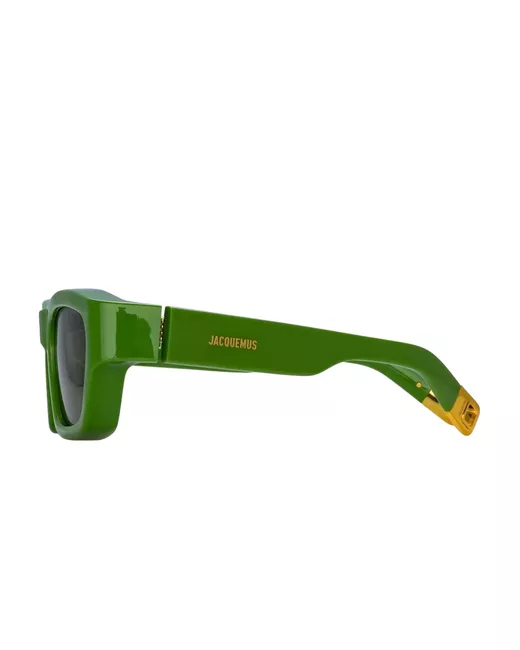 dark green logo print at the arm straight arms curved tips These glasses come with a protective case.