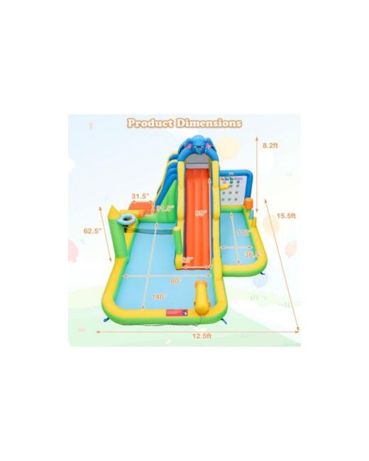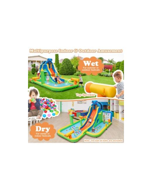 This 9-in-1 inflatable water slide park features a slide, climbing wall, water cannons, sports games, and more. Made from durable Oxford and Pvc fabric, it inflates quickly and offers endless outdoor fun.