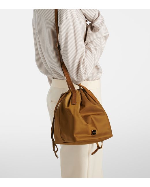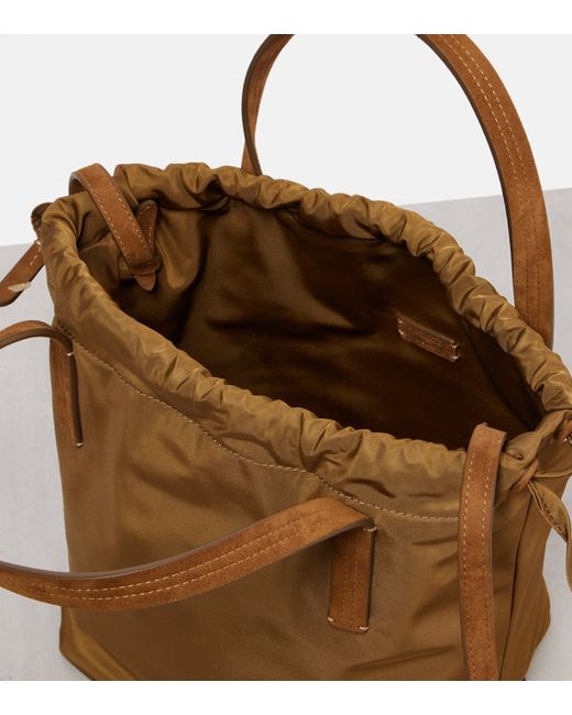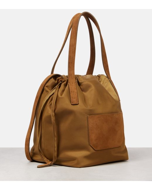 Material: fabric. Lining: fabric. Made in Italy. Designer color name: Safari / Mud. Item color: brown. Trim: leather (suede). Leather shoulder strap, Detachable, adjustable shoulder strap. Front slot pocket. Closure: drawstring top.