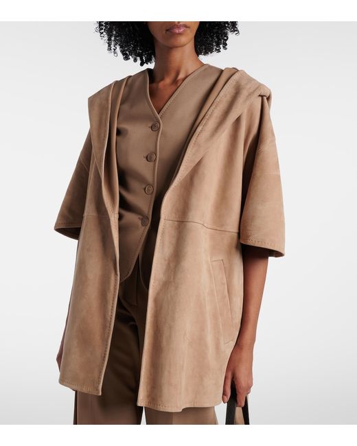 Material: 100% lamb leather (suede). Care instructions: specialist clean. Made in Romania. Designer color name: Taupe. Item color: brown. Material II: 100% lamb leather. Includes: dust bag. Elasticated waistband. Attached belt. Side slits. Leather.