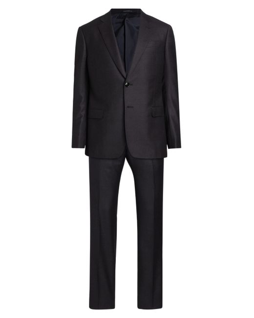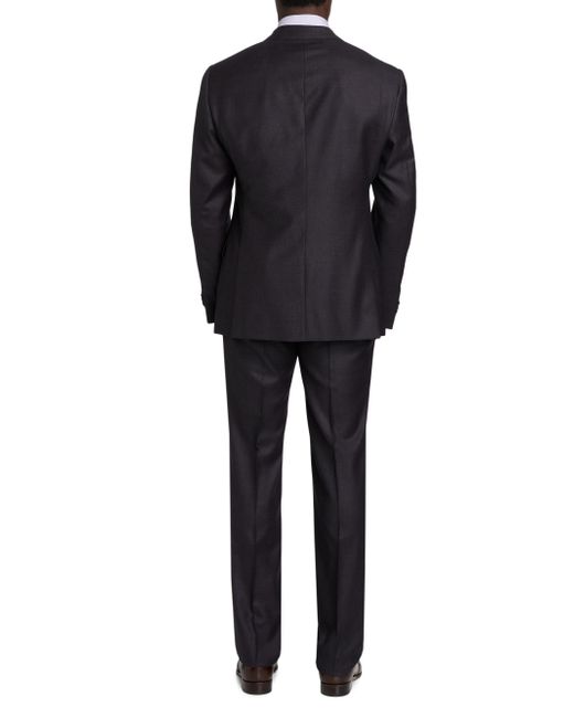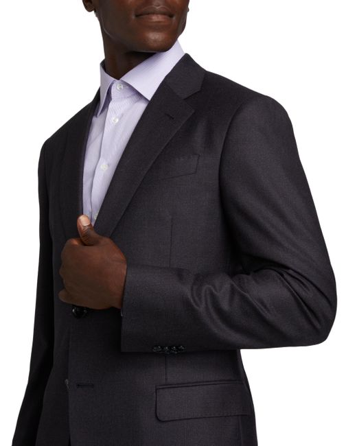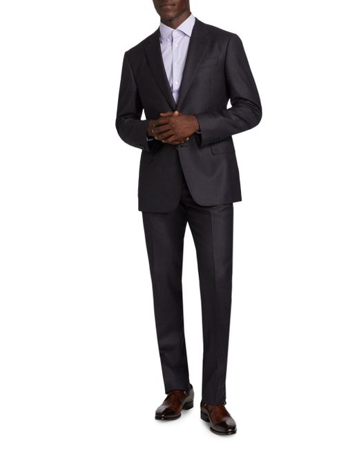 This Giorgio Armani suit is crafted of a wool-cashmere blend. A single-breasted jacket complements creased-front pants. 95% virgin wool/5% cashmere. Dry clean. Made in Italy. JACKET Notch lapel Long sleeves, stacked button cuffs Chest slip pocket Side flap pockets Back vents Single-breasted, two-button closure Lining: 100% viscose PANTS Fly front Creased front Lining: 63% acetate/37% viscose SIZE & FIT Model measurements: 6'2" tall, 40" chest, 31" waist Model is wearing US size 40R ABOUT THE BRAND Since launching his self-named fashion empire in 1975, the Milanese designer has both revolutionized men's fashion and the fashion industry writ large. His now iconic silhouettes forged new directions in menswear. To this day, the Armani name is synonymous with an effortless, approachable Italian style that can be found in its suiting, shoes, accessories and men's fragrances. Men Luxury Coll - Giorgio Armani C > Giorgio Armani > Saks Fifth Avenue > Barneys. Giorgio Armani. Color: Merlot Purple. Size: 44.