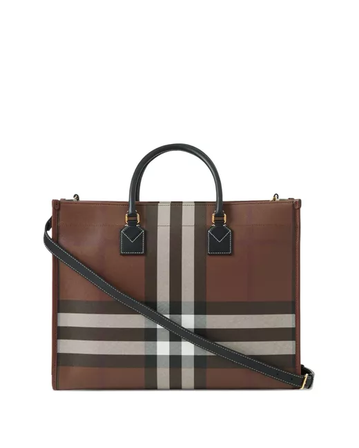 chocolate brown two rolled top handles adjustable detachable shoulder strap check pattern main compartment