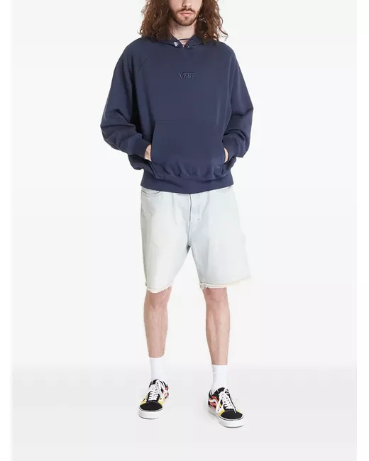 navy blue front pouch pocket drawstring hood embroidered logo at the chest ribbed cuffs and hem