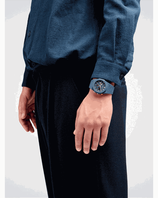 Neptune Blue is distinguished by its new sleek, monochromatic, and minimal design. This timepiece boasts a full blue polycarbonate case and bracelet.