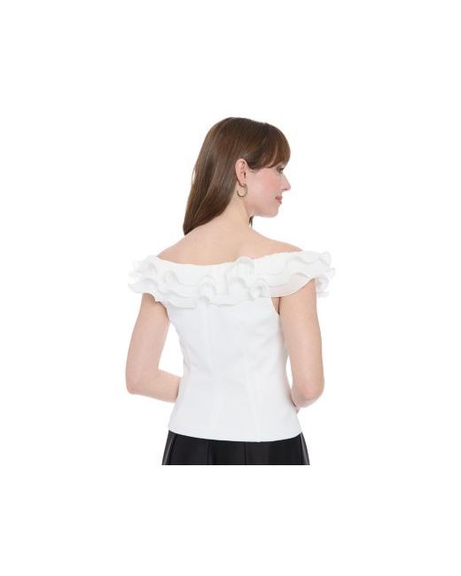 Explore endless styling options in this stunning look from Muse, a sleek scuba crepe top with sweet ruffles around a deep neckline.