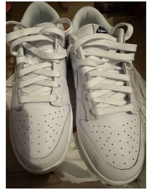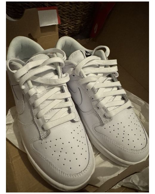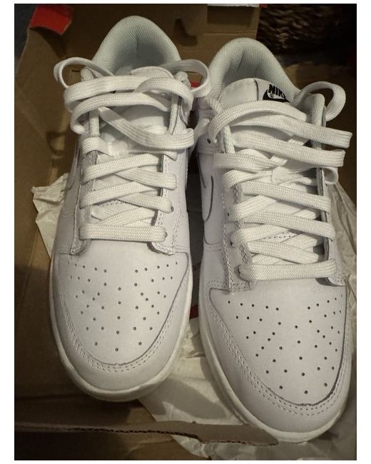 The product is a new pair of Nike white low top dunks in UK size 6. These trainers are designed specifically for women and feature a comfortable leather upper material. The classic sneaker style is accentuated by the Nike logo, making them a stylish and versatile addition to any wardrobe. Perfect for casual everyday wear, these trainers offer both comfort and style in a timeless design.