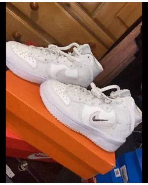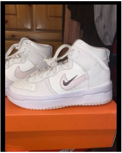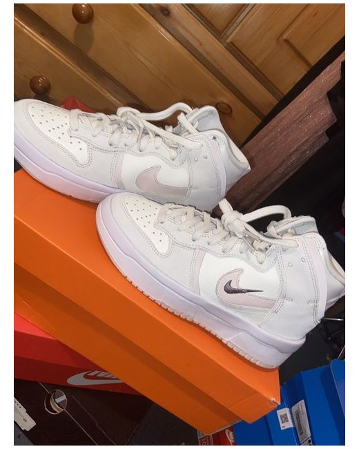 Elevate your sneaker game with these Women's Nike Dunk High Up Sail Flat Pewter Phantom Light Soft Pink trainers. Featuring a high top shoe shaft style, lace-up closure, and a combination of leather upper material and foam insole material, these trainers are perfect for casual occasions in autumn, summer, or spring. With a US shoe size of 6 and a UK shoe size of 4, these Nike trainers are designed for women and have a stylish appearance with accents of the Nike logo and a soft pink colour. The product line is Nike Dunk, and the model is Nike Dunk High. These trainers are not customised, vintage, or handmade. They are perfect for those who love air force themes and are looking for a comfortable and stylish pair of trainers.