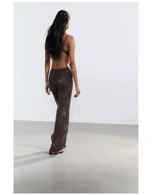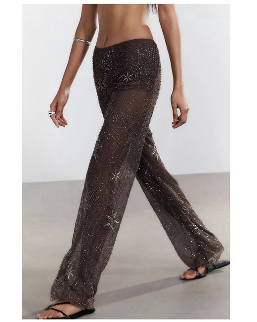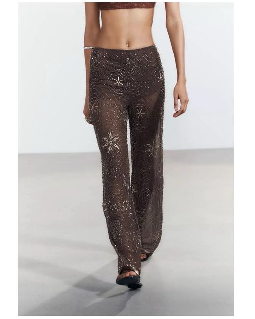 Semi-sheer mid-waist trousers. Featuring contrasting beaded and sequin appliqués. Tonal lining. CHOCOLATE, new with tag , viral , no return