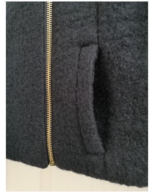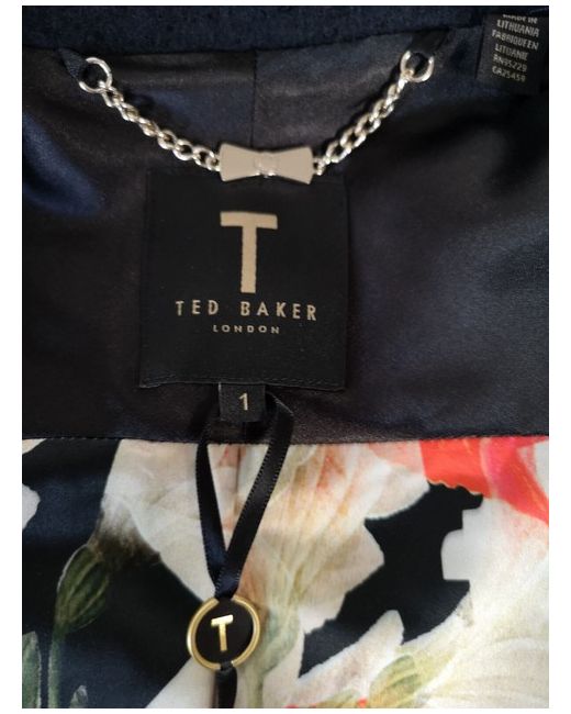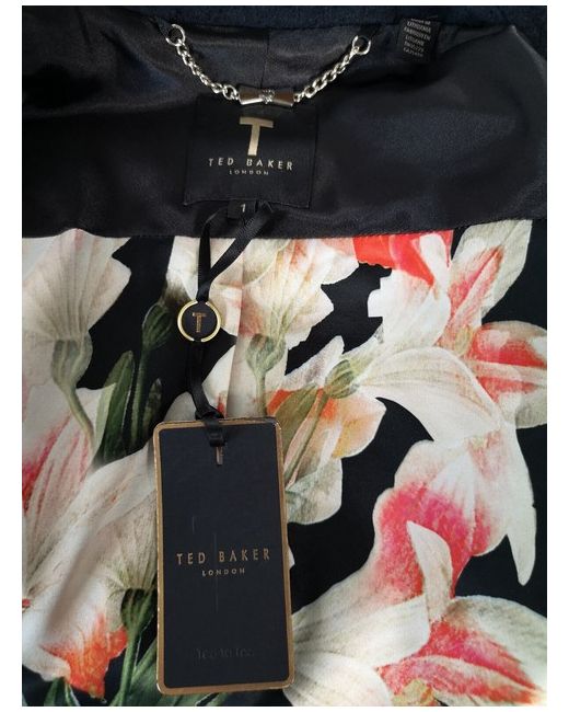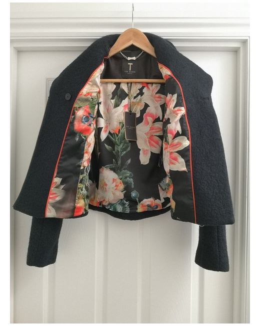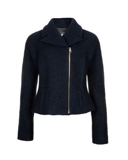 Chic biker-inspired jacket from Ted Baker constructed of a thick wool-blend bouclé fabric in dark midnight blue (looks almost black). Super-versatile and can easily be dressed up with a pencil skirt or down with jeans.