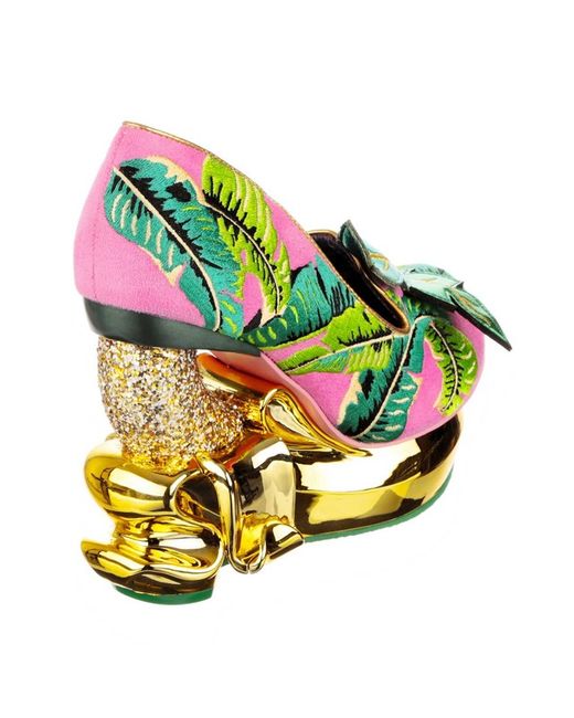 12cm high heels 4cm platform Slip on style Banana concept heel Fully lined Cushioned insole. Give your feet banana appeal with these incredible pink embroidered palm leaf high heels. Banana concept heel.