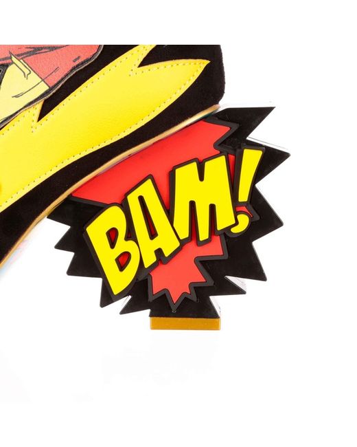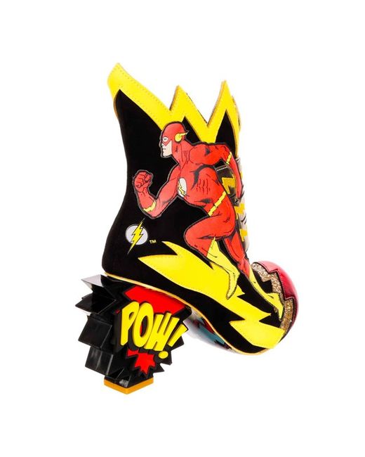 The Flash dashes along the side of these high heeled ankle boots, leaving iconic zippy zigzags in his wake that echo across the boot in yellow and gold glitter. The bright graphic comic book inspired heels will make a big impact when you dash out in these shoes!