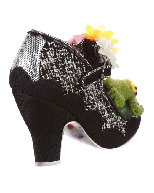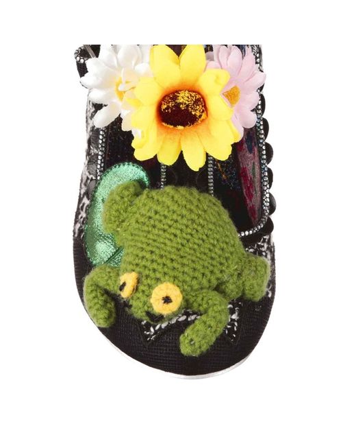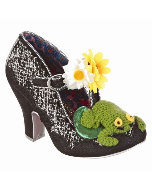 Black high heels with a t-bar strap is decorated with blue glitter, bright flowers and lily pads, and on one toe is Lily the frog, who is ready to leapfrog you to best-dressed! Each Lily the frog is hand-crocheted with love, so they all look a bit different which adds to their charm and personality!