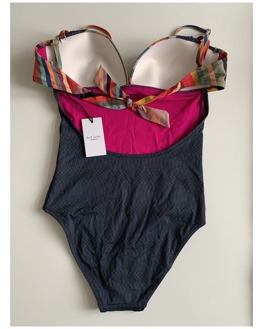 New one piece swimsuit by Paul Smith. Adjustable shoulder and back straps. Measurements as a guide only: Length bottom of bra to bottom-46cm Length top of cup to bottom-56cm Width at top of leg opening-33cm Width at waist level-30cm Width at bottom of bra area-31cm (note has an adjustable tie at the back) Cup size very approximate: 14x17cm and depth roughly 6cm. There is no specific cup sizing on the garment. Please ask any questions. Strictly no returns or refunds.