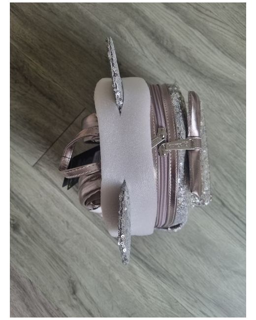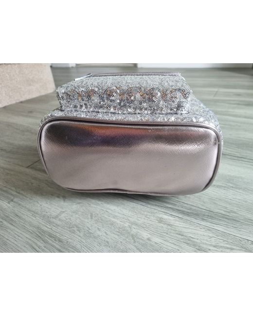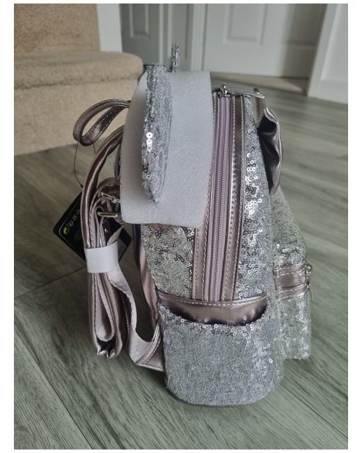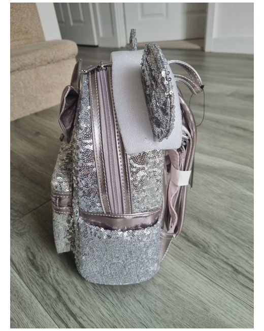 This is a brand new Loungefly Disney mini backpack. It is covered in grey sequins. It has Minnie Mouse ears and a bow. It is brand new with the tag. From a pet and smoke free home.