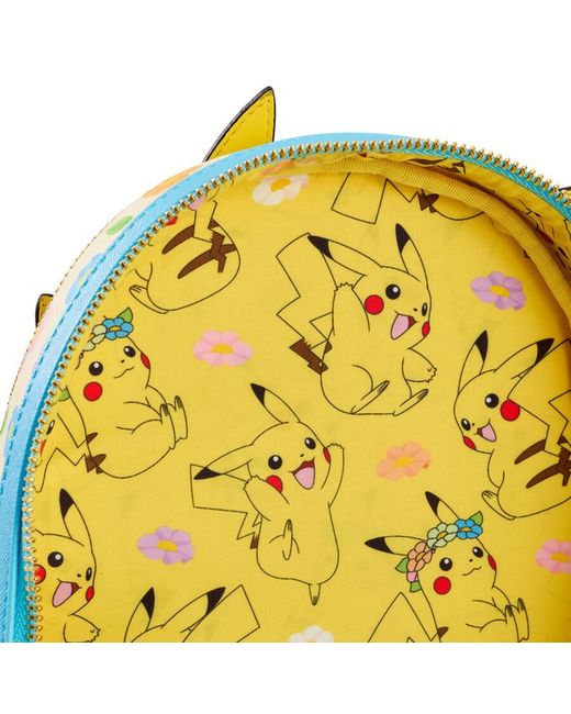 Appliquéd Pikachu with 3D floral crown and tail details. Custom interior lining with playful Pikachu and floral prints.