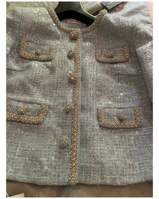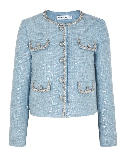 Brand new with tags, this Self-Portrait Blue Boucle Jacket in size 8 is a stylish addition to any woman's wardrobe. Made from polyester, this basic jacket features a chic blue colour that will elevate any outfit. Perfect for adding a touch of sophistication to your look.