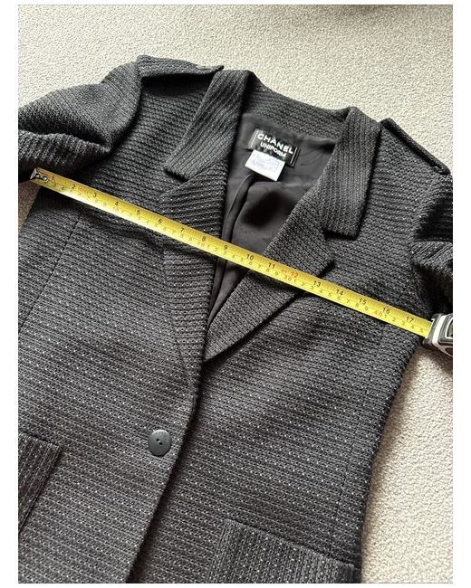 New Chanel Beautiful Classic Black Textured Blazer Jacket Logo Buttons FR 36 UK 8-10. This Chanel black textured blazer jacket is a stylish and versatile piece for any wardrobe. Made in France from mixed fabric tweed with 100% silk lining beautifully patterned featuring a floral design with the iconic CC logo.
