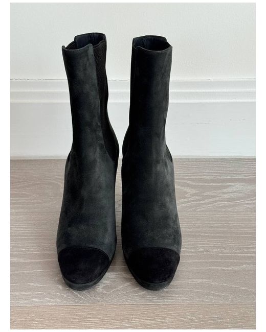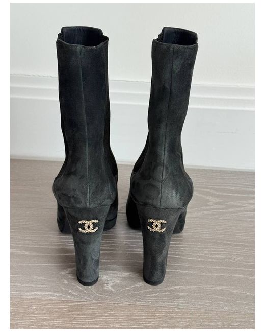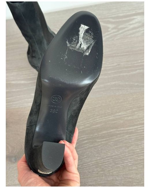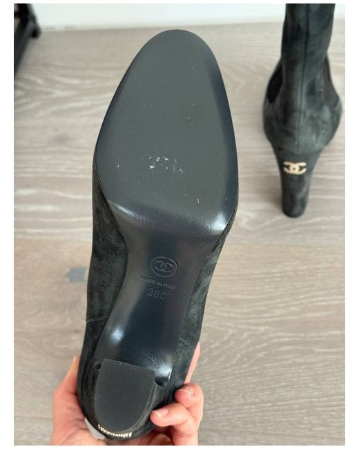 Size: EU 38C (UK 5 / US 7). These luxury boots feature a sleek silhouette with a subtly rounded almond toe, a comfortable block heel, and elastic side panels for an easy pull-on Chelsea-style fit. The standout detail is the sparklingcrystal-encrusted CC Chanel logo on each heel—instantly recognisable and effortlessly chic.