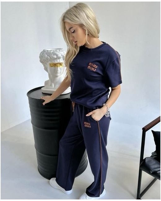 This stunning two-piece set from Miu Miu includes a navy blouse and skirt in a size L, perfect for a regular fit. Made from polyester, this machine washable outfit is ideal for the summer season. The set does not feature a vintage look and is not handmade, providing a stylish and easy-to-care-for addition to any woman's wardrobe.