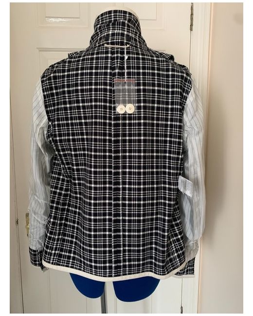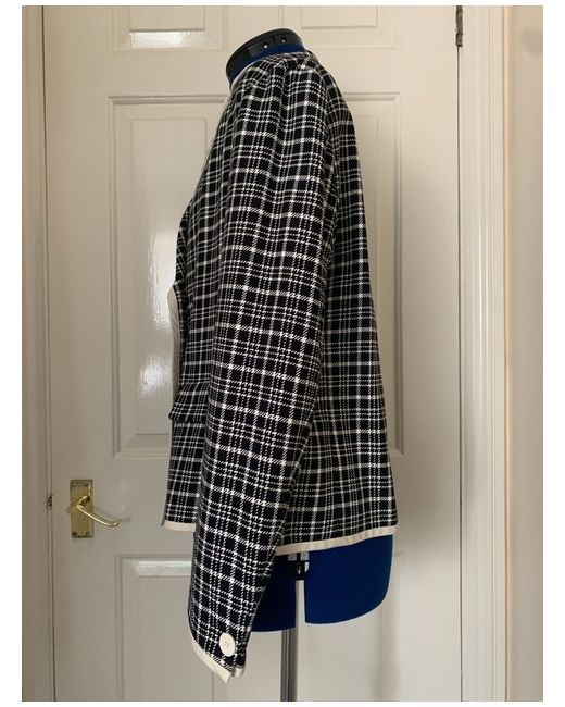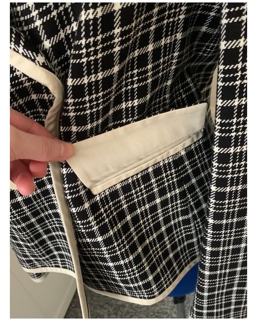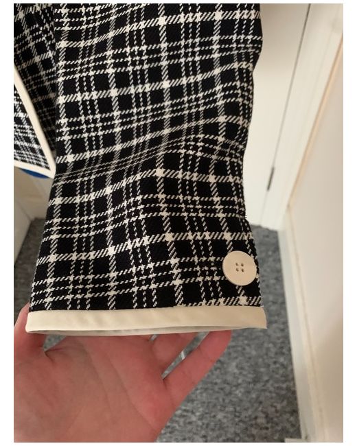 A blazer with an interesting check pattern with the white colour edge. Double breasted collar. Looks great paired with casual or formal clothes. Resembles the look of the Coco Chanel jacket. Extra two buttons attached.