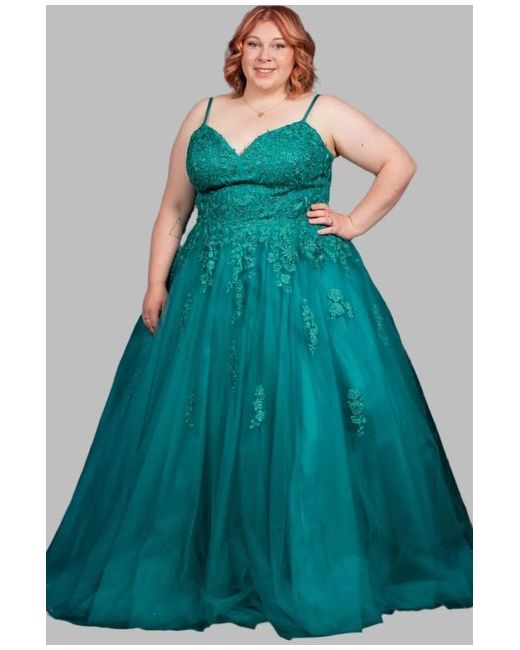 The back showcases a corset-style design, while the full pleated tulle skirt is embellished with lace motifs. It fastens with a zip and hook-and-eye closure.